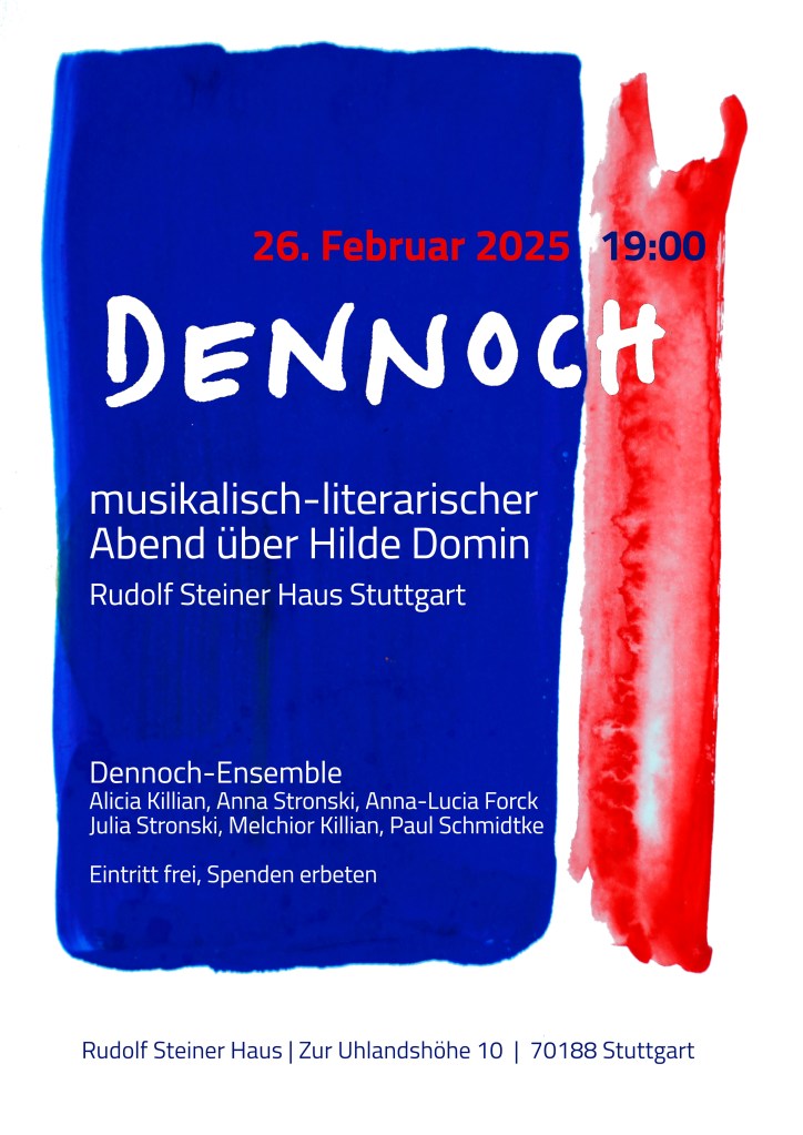 Es erwartet uns ein musikalisch-lyrisches Programm zum Leben und Werk der Dichterin Hilde Domin. Aufgeführt vom DENNOCH-Ensemble. Näheres dazu hier. - Donnerstag, 27.02.