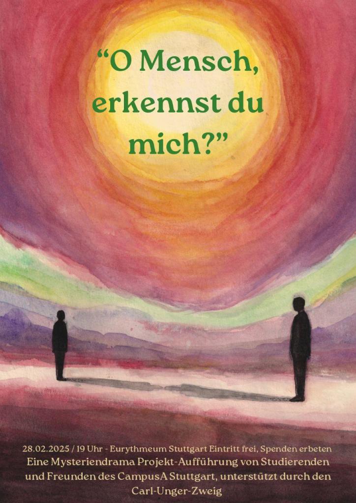 Am letzten Abend der bildungsART dürfen wir uns auf eine Mysteriendrama Projekt-Aufführung von Studenten und Freunden des CampusA freuen. Unter dem Titel O Mensch, erkennst du mich? zeigt ein junges Ensemble – untestützt vom Carl-Unger-Zweig – einige Bilder aus den Mysteriendramen Rudolf Steiners.